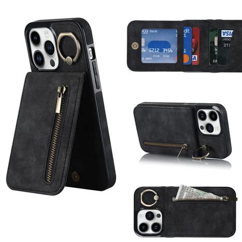 Funda para iPhone 13 Pro Retro Ring y Zipper con Ranura para Tarjeta RFID (Negro)