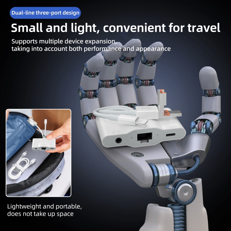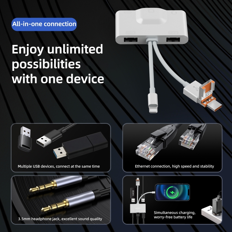El adaptador multifunción tipo C/8 pines/USB-A, a través de la interfaz RJ45, puede conectar dispositivos con interfaz tipo C/8 pines/USB-A a Ethernet, para lograr un acceso a Internet continuo y rápido.Al navegar por Internet, use el conector de audio de 3,5 mm para reproducir el sonido y experimentar una sensación diferente.Use los conectores USB y tipo C para importar fotos directamente desde la cámara digital al dispositivo con un cable de datos y un convertidor.También puede expandir el dispositivo con una unidad flash USB de menor consumo, un teclado o usar auriculares de 3,5 mm mientras se carga el dispositivo.