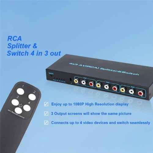 - 1x Conmutador AV Compuesto de Señal de Audio y Video RCA 4 Entradas 3 Salidas Caja Divisora Enchufe EE.UU
