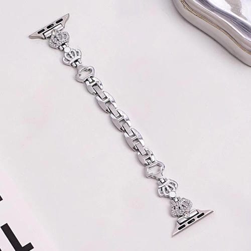 Correa de metal con diamantes y cadena de corona para Apple Watch de 38, 40, 41 y S11 de 42 mm (plata)