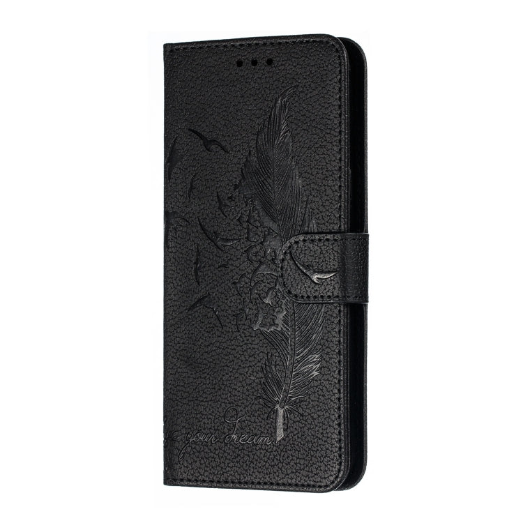 Estuche de Cuero LG K50 con Tapa Horizontal, Textura Litchi, Patrón Plumas, Billetera y Soporte (Negro)