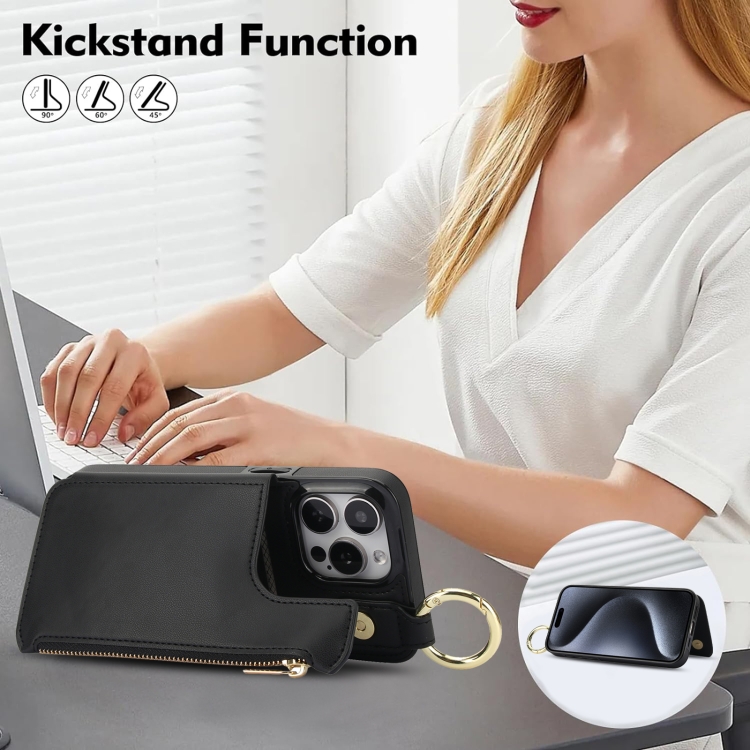 Estuche para Teléfono iPhone 16 Pro Cremallera y Anillo Doble Hebilla Antirrobo (Negro)