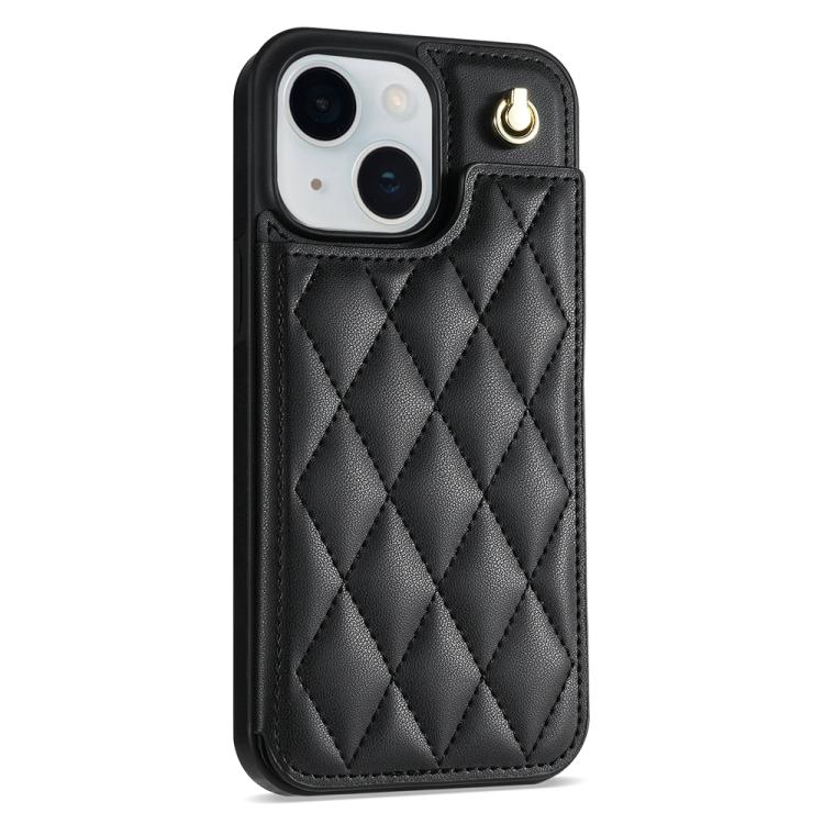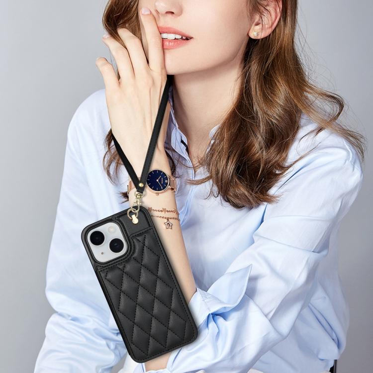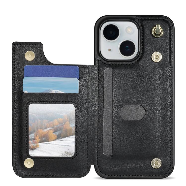 Estuche para Teléfono iPhone 13/14 con Ranuras para Tarjetas y Hebilla Doble Rombal con Cordón (Negro)