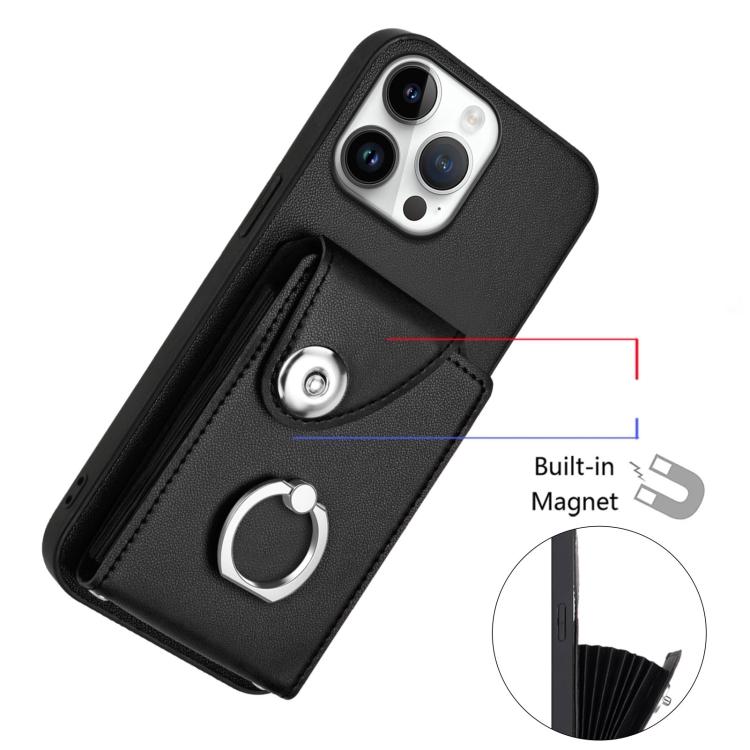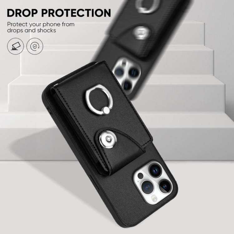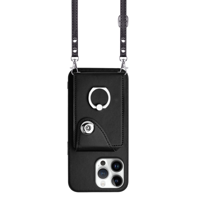 Estuche para teléfono iPhone 16 Pro Max con soporte para tarjetas y anillo con cordón largo (Negro)