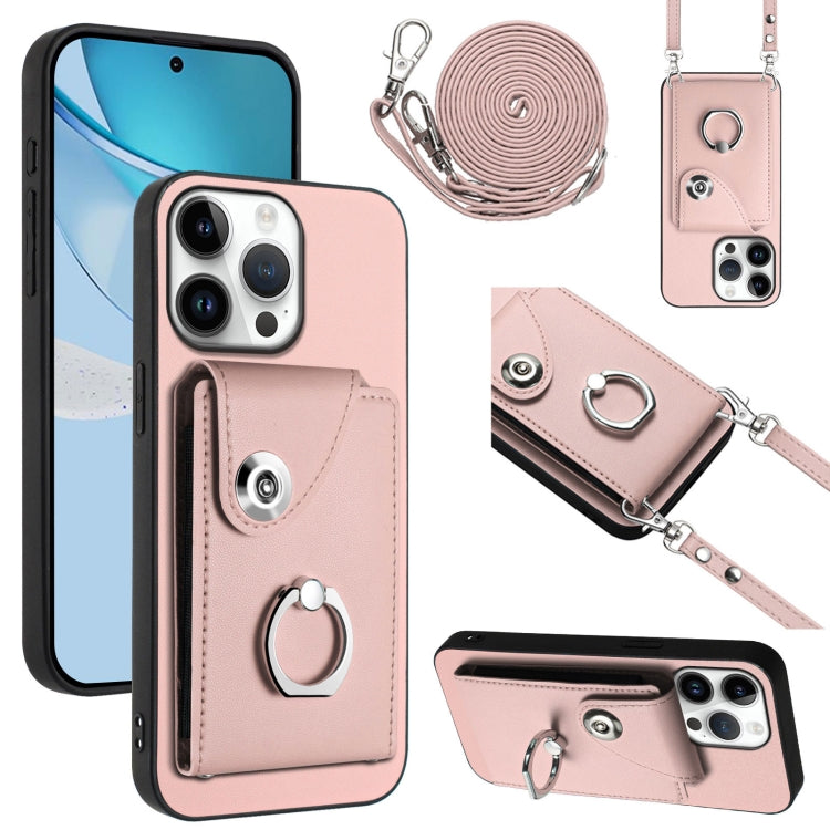 Estuche para Teléfono iPhone 16 Pro Max Soporte Tarjetas Anillo Cordón Largo (Rosa)
