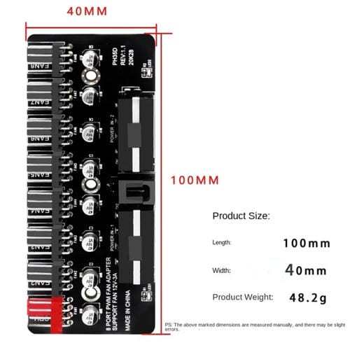 - Expansión a 8 Puertos para Ventiladores, Alimentación directa desde fuente de poder, Soporte para Ventiladores de alta potencia (12V 2A), dimensiones aproximadas 10 x 4 cm, peso 48,2 g, incluye Adhesivo EVA y 10 ataduras de Cable de nailon