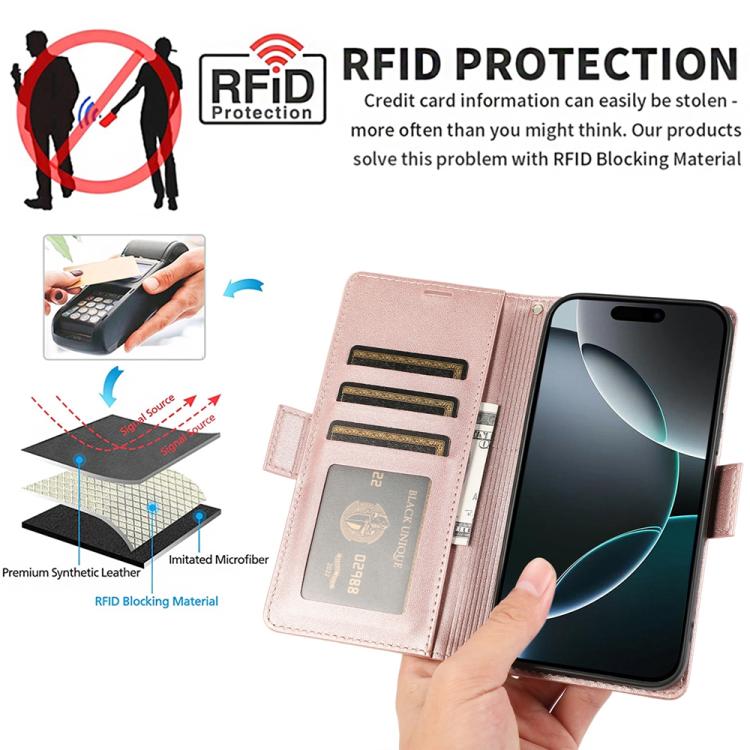 Funda de cuero antirrobo RFID con hebilla lateral para iPhone 17 Pro (oro rosa)