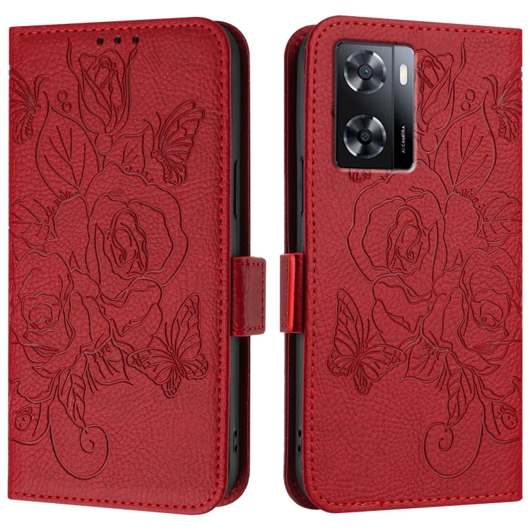 Funda de Cuero Antirrobo Rfid con Relieve Rosa para Oppo A57S 4G / A57E 4G / A77S 4G (Roja)