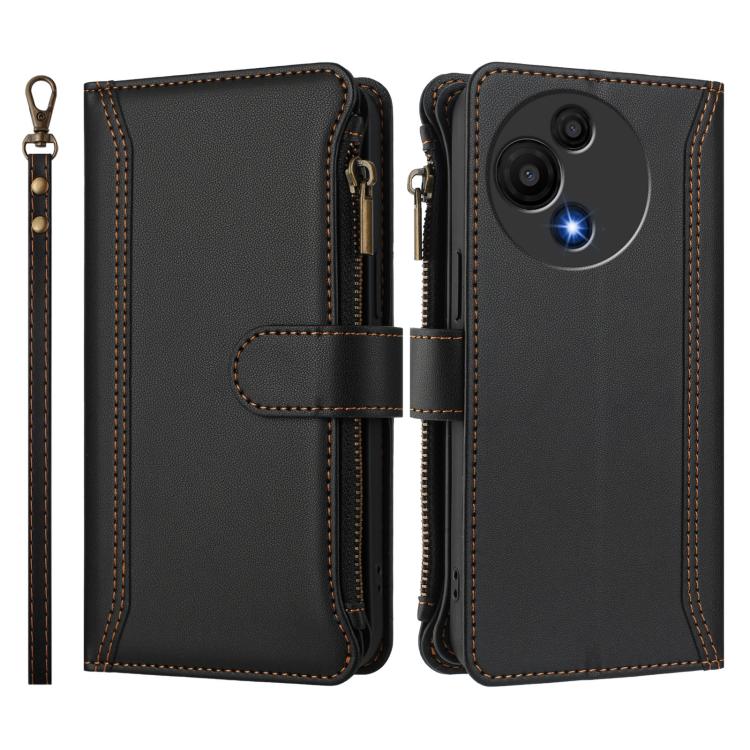 Funda de cuero con cierre magnético para TCL 605/60 SE, 9 ranuras para tarjetas, cremallera y correa de mano (negra)