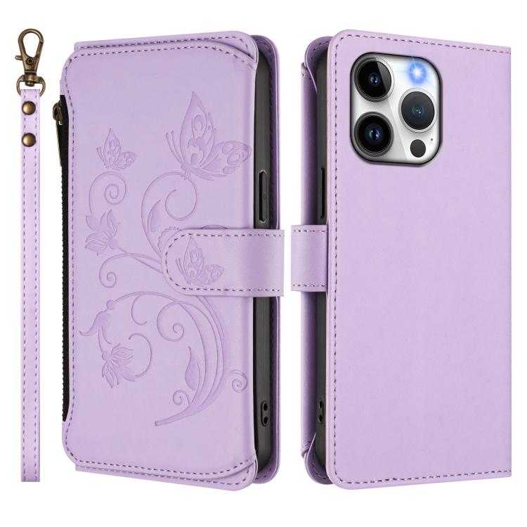 Funda de cuero con cremallera para iPhone 15 Pro, diseño de mariposas, flores y amor (morado claro)