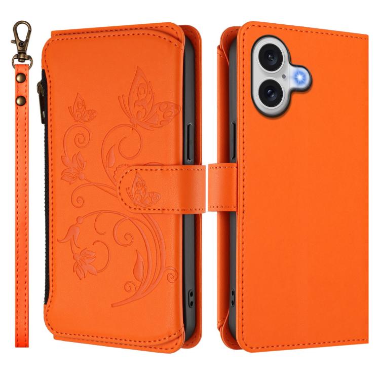 Funda de cuero con cremallera para iPhone 17, diseño de mariposas, flores y amor (naranja)