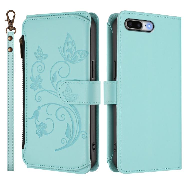 Funda de cuero con cremallera para iPhone 7 Plus/8 Plus, diseño de mariposas, flores y amor (verde menta)