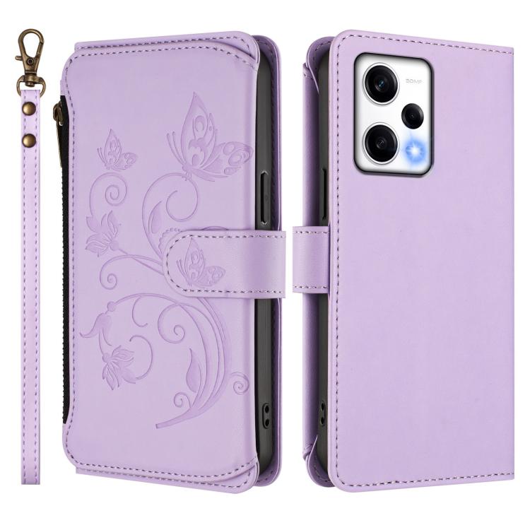 Funda de cuero con cremallera para Redmi Note 12 Pro+ Global / Note 12 Explorer, diseño de mariposas, flores y amor (morado claro)