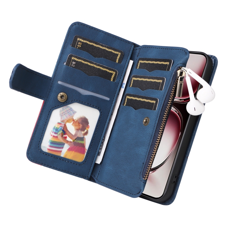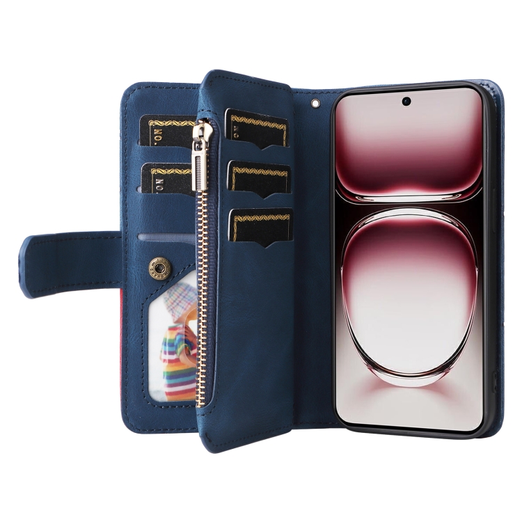 Funda de Cuero con Cremallera para Teléfono Oppo Reno12 Pro Global, con 9 Ranuras para Tarjetas y Dos Colores (Azul)