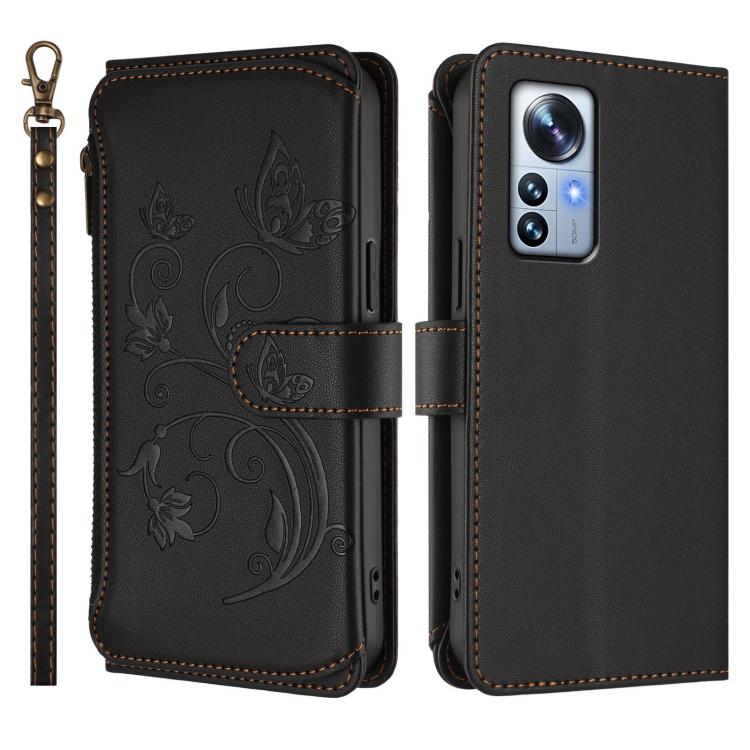 Funda de cuero con cremallera para Xiaomi 12 Pro / 12S Pro, diseño de mariposas, flores y múltiples tarjetas (negro)