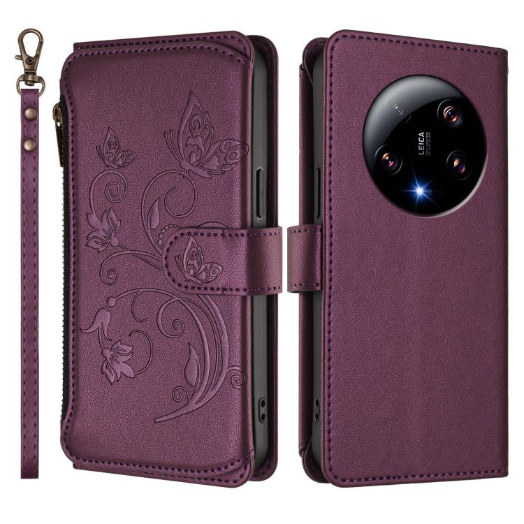 Funda de cuero con cremallera para Xiaomi 13 Ultra, diseño de mariposas, flores y mariposas (morado oscuro)
