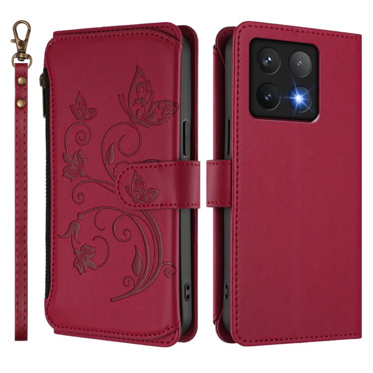Funda de cuero con cremallera para Xiaomi 14T Pro, diseño de mariposas, flores y mariposas (rojo vino)