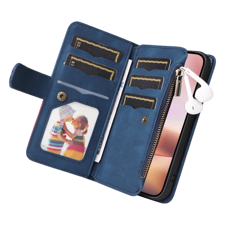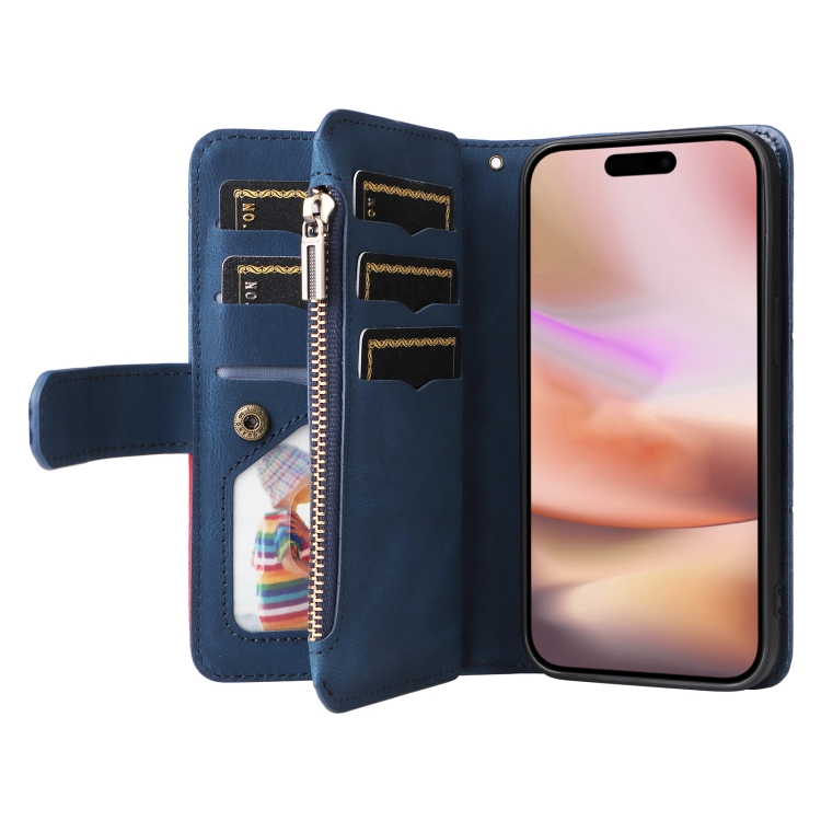 Funda de Cuero con Cremallera para iPhone 16 Plus con 9 Ranuras para Tarjetas (Azul)