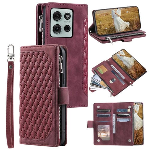 Funda de Cuero con Cremallera y Textura de Cuadrícula para Motorola Moto G75 5G con Cordón (Rojo Vino)