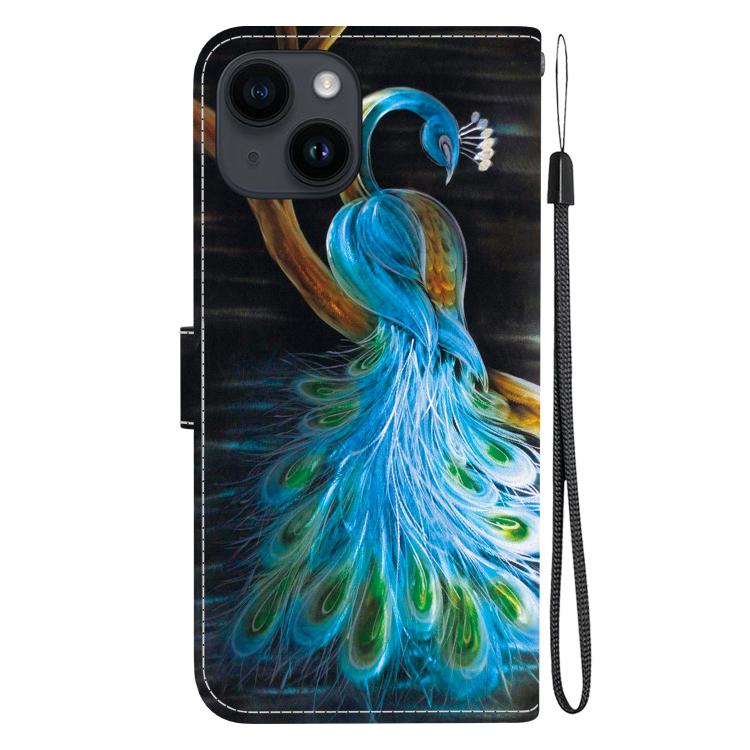 Funda de Cuero para iPhone 15 Plus con Dibujo de Colores y Textura de Cristal (Pavo Real)