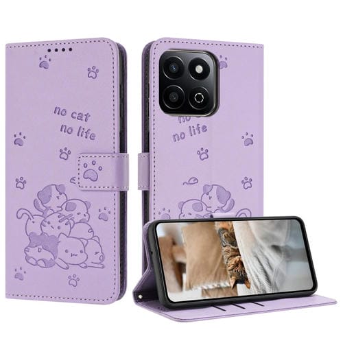 Funda de Cuero para Honor X7C 4G/200 con Diseño de Gatito en Relieve y Cordón (Morado)