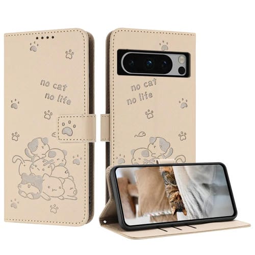 Funda de Cuero Google Pixel 8 Pro con Diseño de Gatito en Relieve y Cordón (Beige)