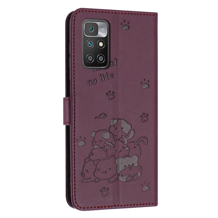 Funda de Piel con Diseño de Gatito En Relieve y Cordón para Redmi 10/10 Prime (Rojo Vino)