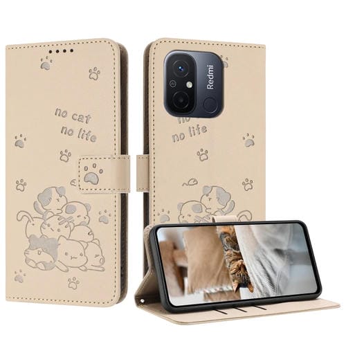 Funda de Piel con Diseño de Gatito En Relieve para Redmi 11A 4G Global con Cordón (Beige)