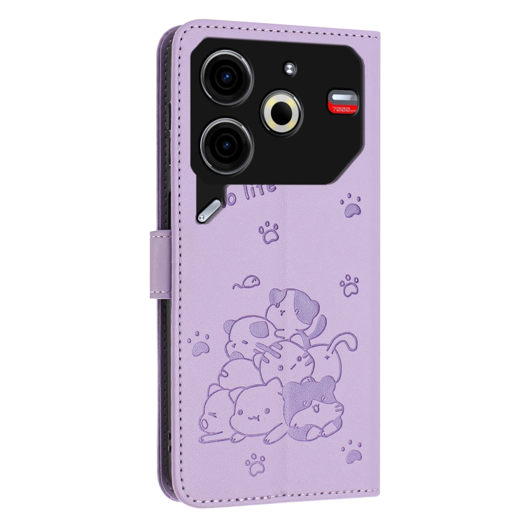 Funda de Cuero para Tecno Pova 6 Neo con Diseño de Gatito en Relieve y Cordón (Morado)