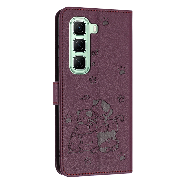 Funda de Cuero Infinix Hot 50 5G con Diseño de Gatito en Relieve y Cordón (Rojo Vino)