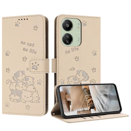 Funda de Piel con Diseño de Gatito En Relieve y Cordón para Xiaomi Poco C65/Poco M6 5G (Beige)