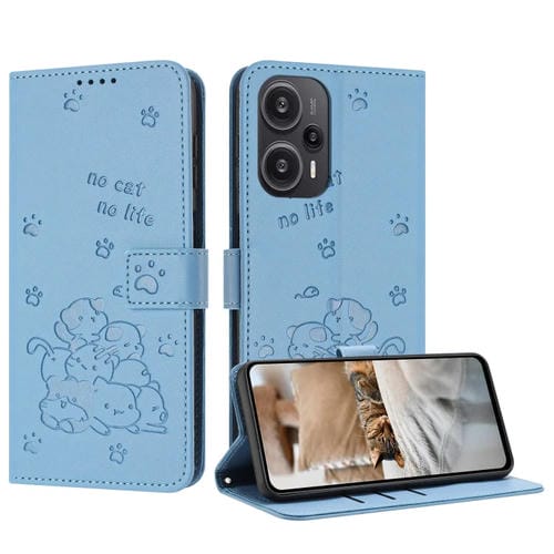 Funda de Piel con Diseño de Gatito En Relieve y Cordón para Xiaomi Poco F5 (Azul)
