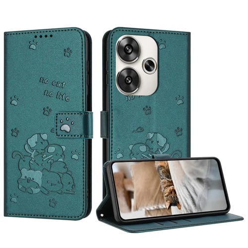 Funda de Piel con Diseño de Gatito En Relieve y Cordón para Xiaomi Poco F6 (Verde Oscuro)