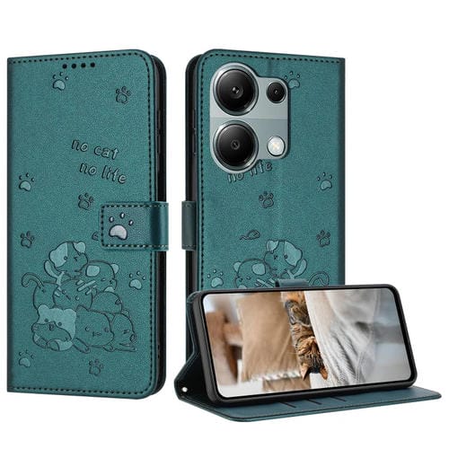 Funda de Piel con Diseño de Gatito En Relieve y Cordón para Xiaomi Poco M6 Pro 4G (Verde Oscuro)