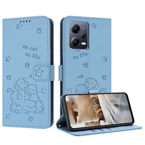 Funda de Piel con Diseño de Gatito En Relieve y Cordón para Xiaomi Poco X5 5G (Azul)
