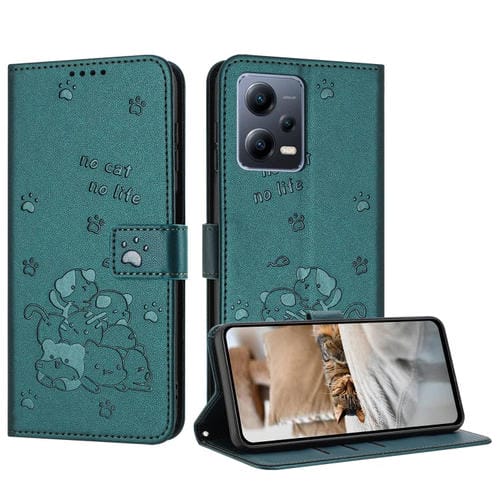 Funda de Piel con Diseño de Gatito En Relieve para Xiaomi Poco X5 5G con Cordón (Verde Oscuro)