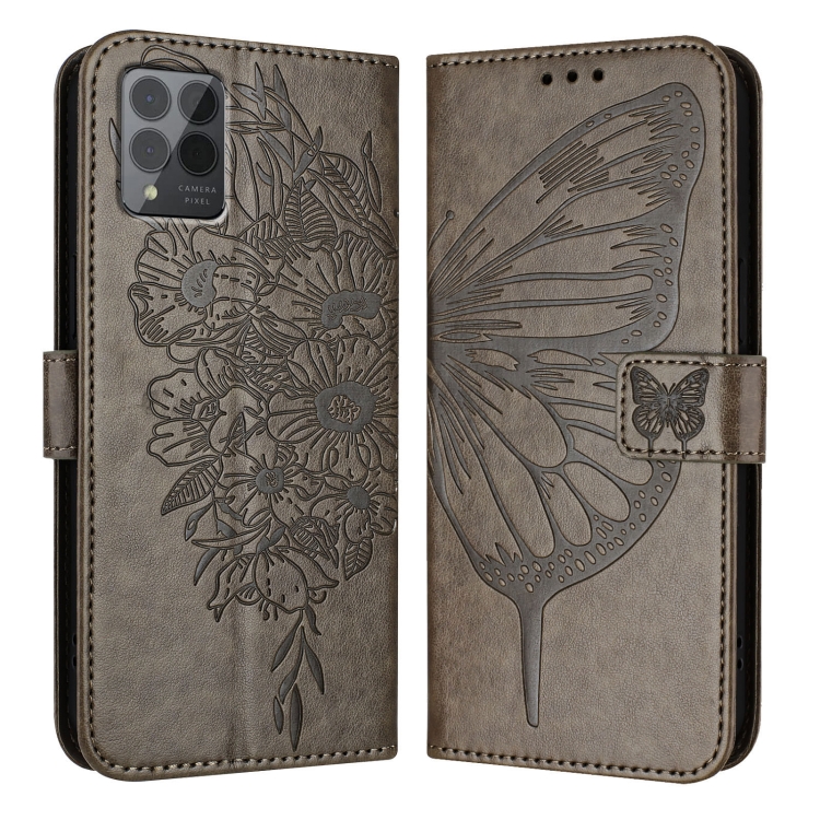 Funda de Cuero para T-Mobile Revvl 6 Pro/6X Pro con Diseño de Mariposa en Relieve (Gris)