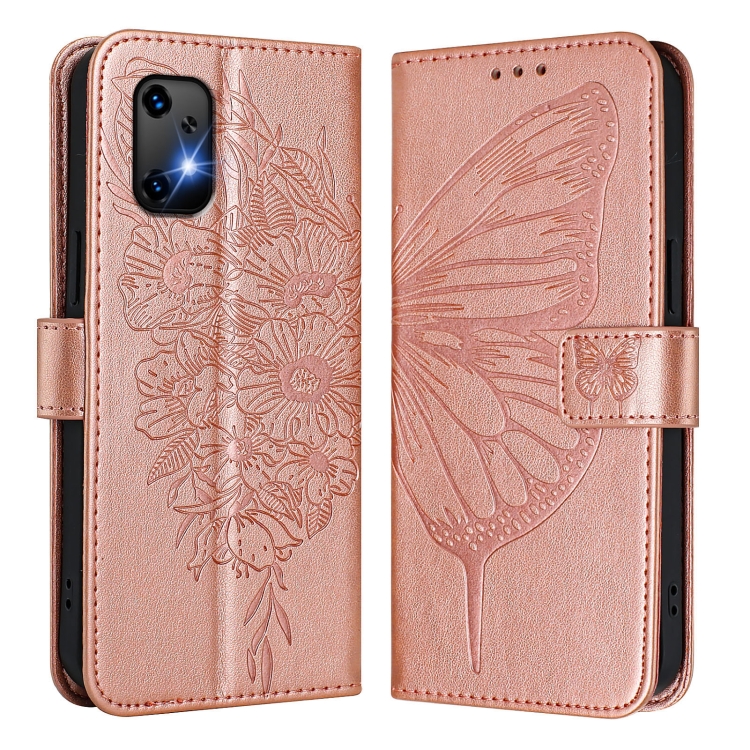 Funda de Cuero para Umidigi Bison X20 con Diseño de Mariposa En Relieve (Oro Rosa)