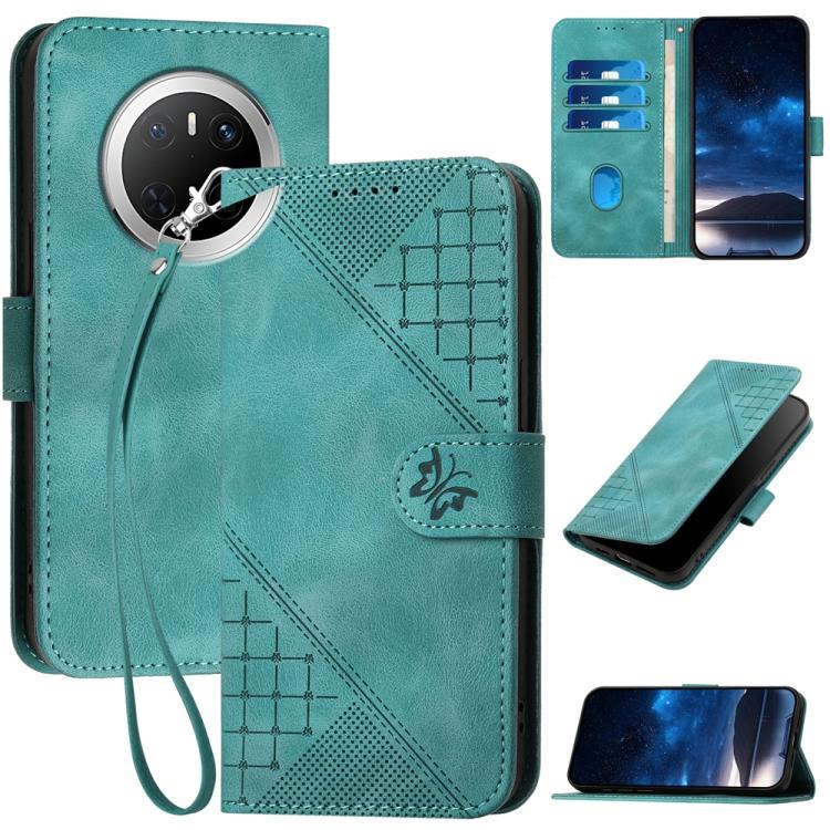Funda de Cuero Huawei Mate 70 con Diseño de Mariposa En Relieve y Cordón (Azul Claro)