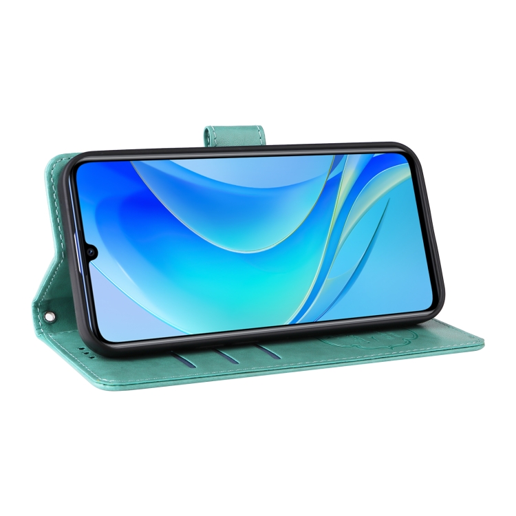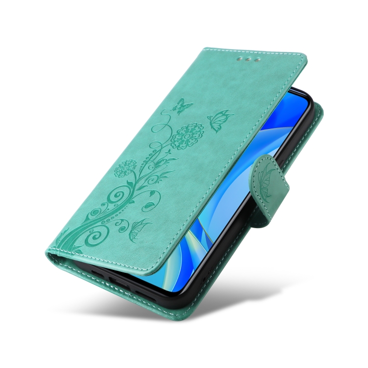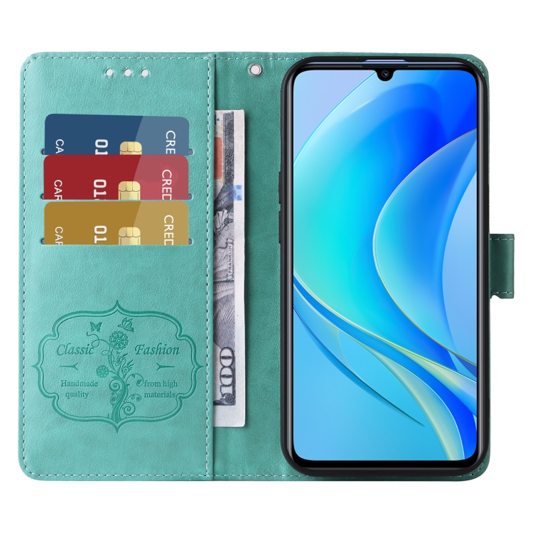Funda de Cuero para Huawei Nova Y70 Plus con Diseño de Mariposas y Flores en Relieve (Verde)