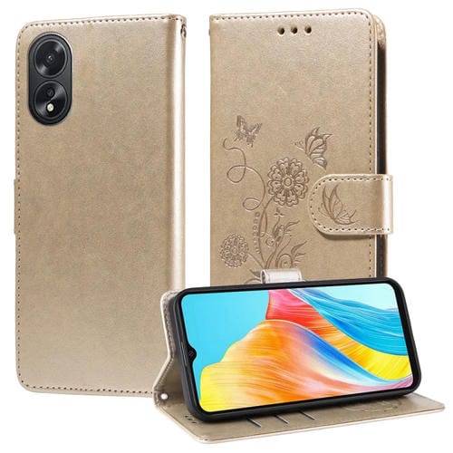 Funda de Cuero con Diseño de Mariposas y Flores En Relieve para Oppo A38 4G Global/A18 4G (Dorada)
