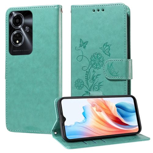 Funda de Cuero con Diseño de Mariposas y Flores En Relieve para Oppo A59 5G (Verde)