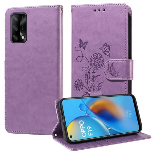 Funda de Cuero con Diseño de Mariposas y Flores En Relieve para Oppo A74 4G / F19 4G / F19S / A95 4G (Morado)