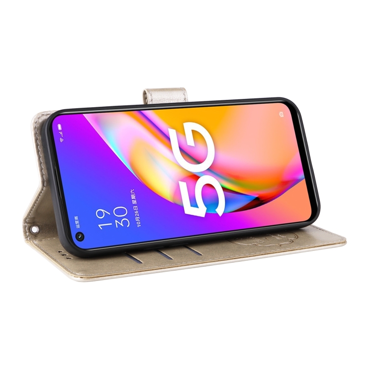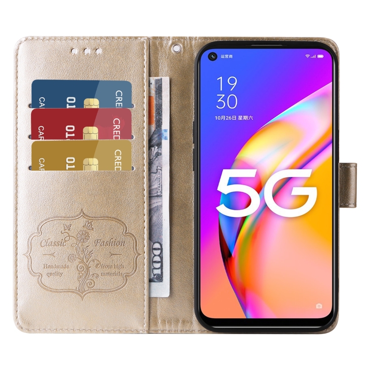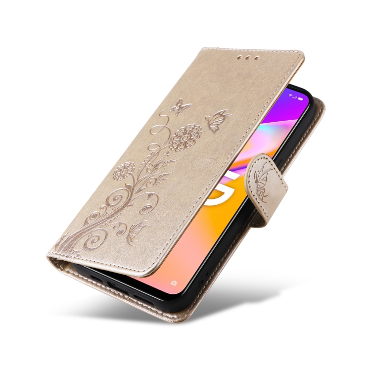 Funda de Cuero con Diseño de Mariposas y Flores En Relieve para Oppo A74 5G/A54 5G (Dorada)
