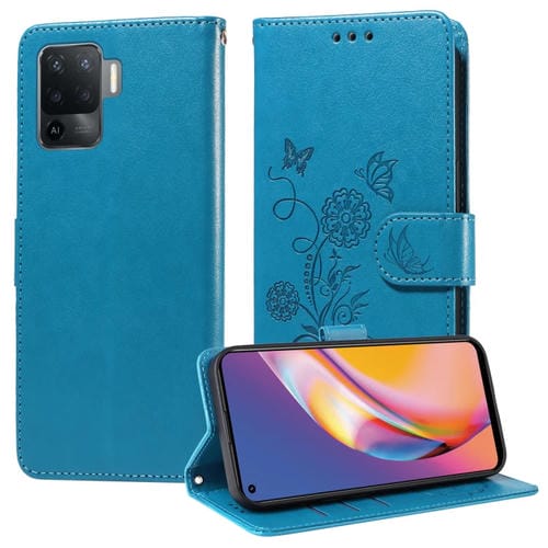 Funda de Cuero con Diseño de Mariposas y Flores En Relieve para Oppo A94 4G/5G/A95 5G/F19 Pro (Azul)