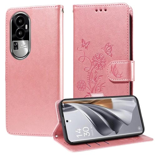 Funda de Cuero con Diseño de Mariposas y Flores En Relieve para Oppo Reno10/Reno10 Pro (Oro Rosa)