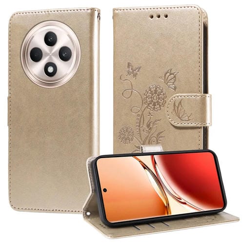 Funda de Cuero con Diseño de Mariposas y Flores En Relieve para Oppo Reno12 F 5G (Dorada)