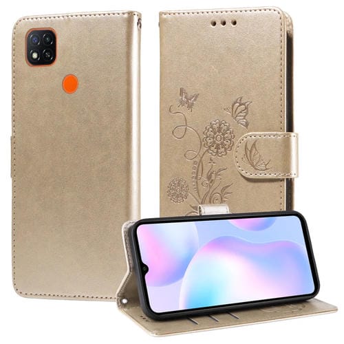 Funda de Cuero con Diseño de Mariposas y Flores En Relieve para Redmi 10A 4G (Dorada)