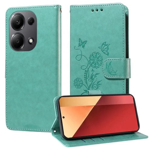 Funda de Cuero con Diseño de Mariposas y Flores En Relieve para Redmi Note 13 Pro 4G (Verde)