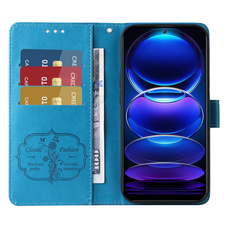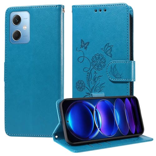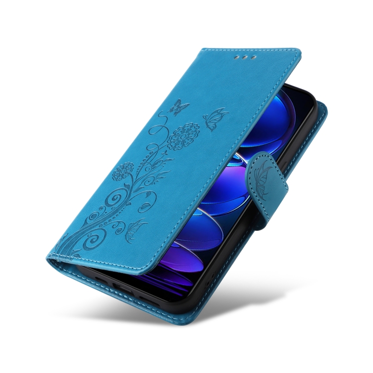 Funda de Cuero con Diseño de Mariposas y Flores En Relieve para Xiaomi Poco X5 5G (Azul)